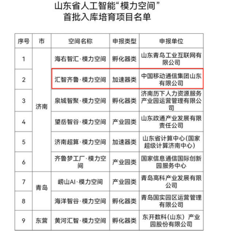 山东移动“汇智齐鲁·模力空间”项目入选省级首批培育库
