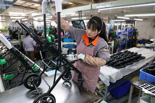 万宝童车有限公司的工人在组装手推车