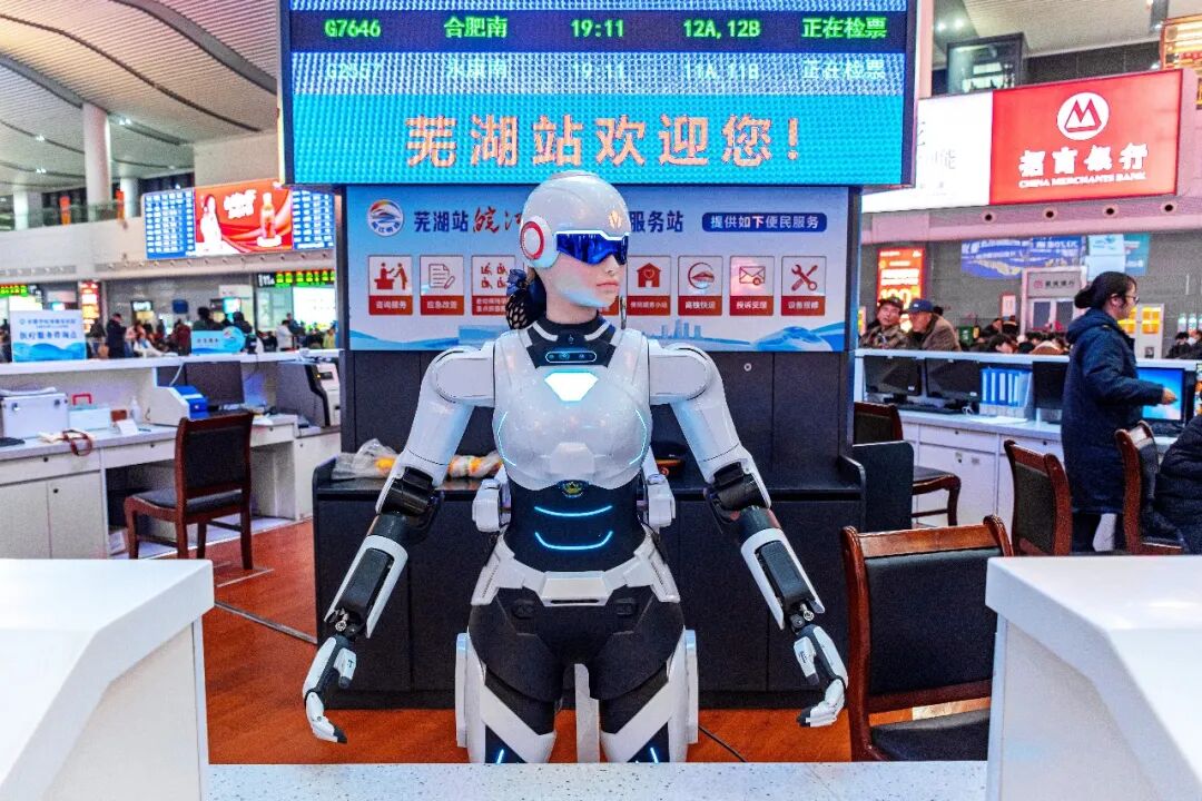 不只在列车之上,车站服务也迎来智能新伙伴。芜湖站两台人形机器人“墨茵”正式上岗,分别驻守“皖江明珠”雷锋服务站和“两区一室”候车区,为旅客带来全新出行体验。