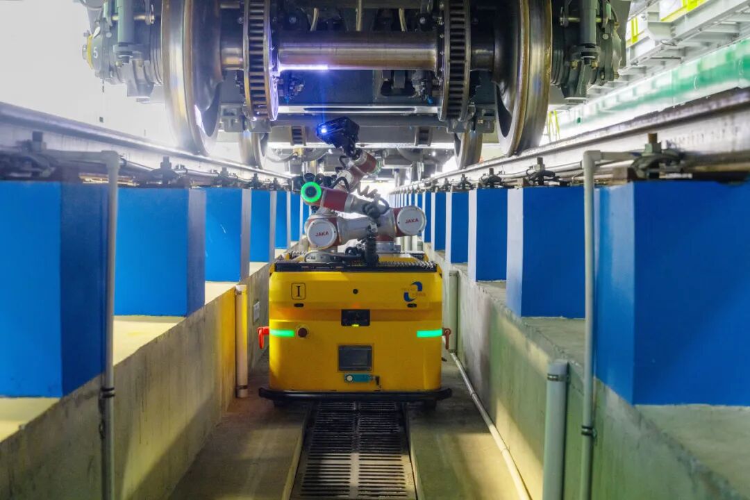在上海虹桥动车运用所,动车组检测机器人正精准守护动车组走行部安全。机械臂在车底闪转挪移,细致完成着一级检修作业,全力保障动车组安全上线平稳运行。