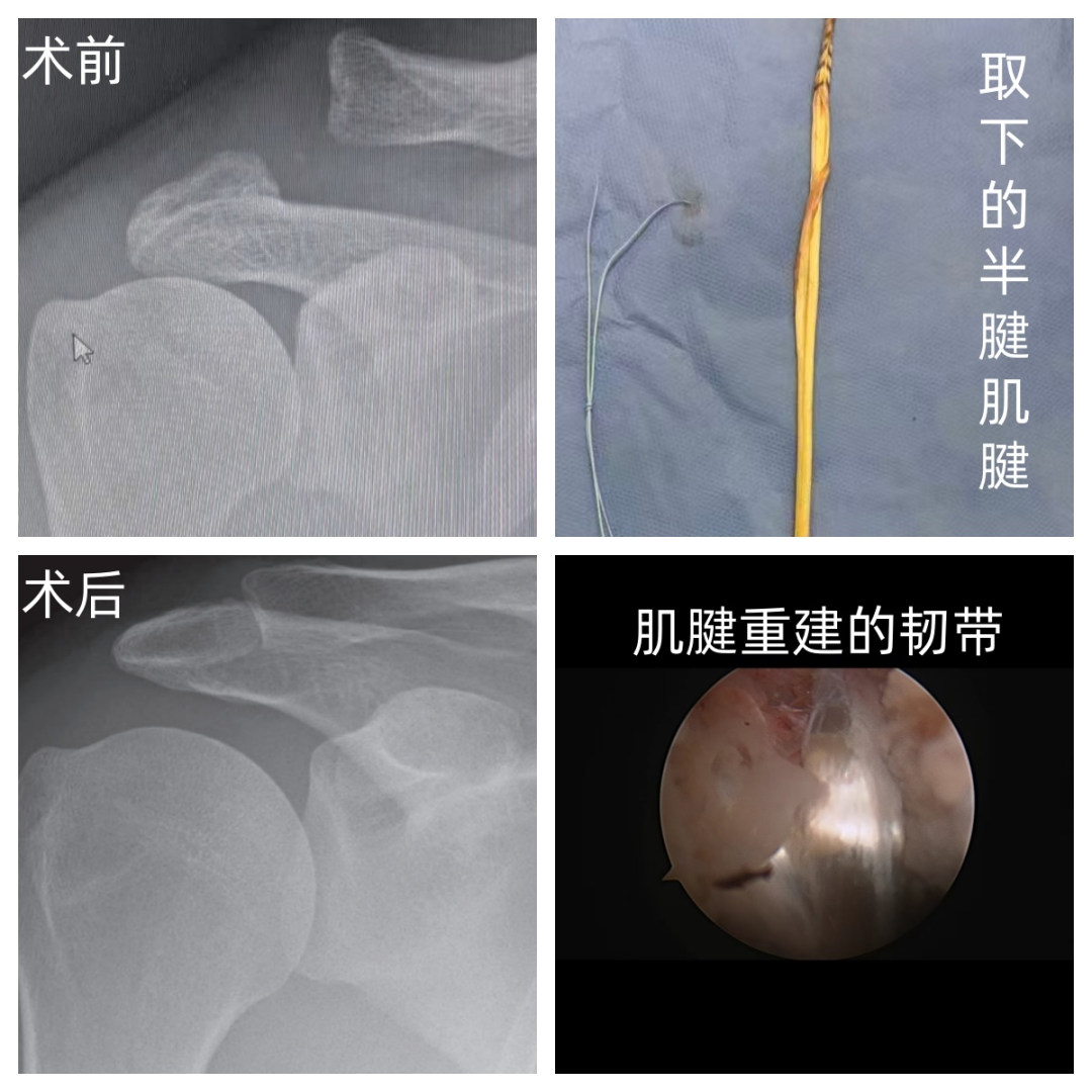那么对于这种陈旧性的脱位如何妥善治疗呢?经过团队的充分论证和精心准备,曲华正应用关节镜辅助半腱肌腱移植重建喙锁韧带技术,成功为其实施了手术。这种更接近生理性的固定方式,既没有在骨头上钻孔,避免了骨折的风险,又没有内植物,减少了患者花费而且不需要二次手术,还利用肌腱重建了解剖结构,降低了固定失效的风险,取得了患者满意的效果。