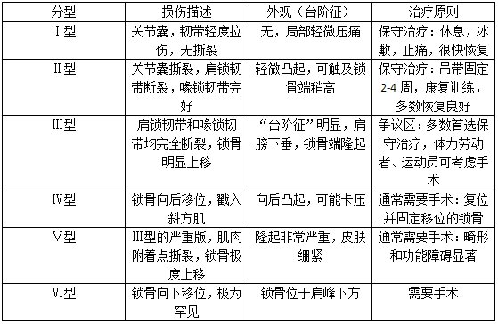 手术指征包括:经充分康复(通常3-6个月)后,仍持续疼痛、无力,严重影响生活和运动;对肩部力量、耐力要求极高,手术可提供更稳定的解剖复位;明显的畸形与美观问题:年轻患者对“台阶征”外观难以接受;IV、V、VI型因移位严重,保守治疗难以复位,通常建议手术;合并其他损伤:如合并肩袖撕裂、骨折等。