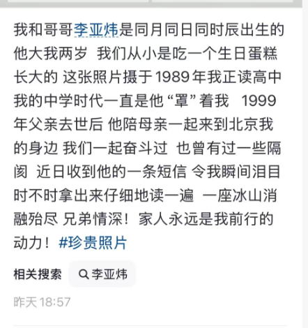 2月26日,李亚鹏发文被哥哥信息感动泪目: