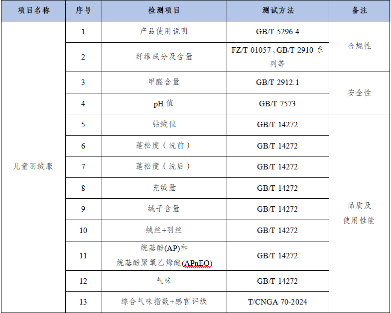测试项目及依据:本次比较试验依据GB 31701-2015《婴幼儿及儿童纺织产品安全技术规范》、GB/T 5296.4-2012《消费品使用说明 第4部分 纺织品和服装使用说明》、GB/T 14272-2021《羽绒服装》以及T/CNGA 70-2024《羽绒羽毛气味的检测和评价湿态激发法》等标准对样品的合规性、安全性、品质及使用性能进行检测。