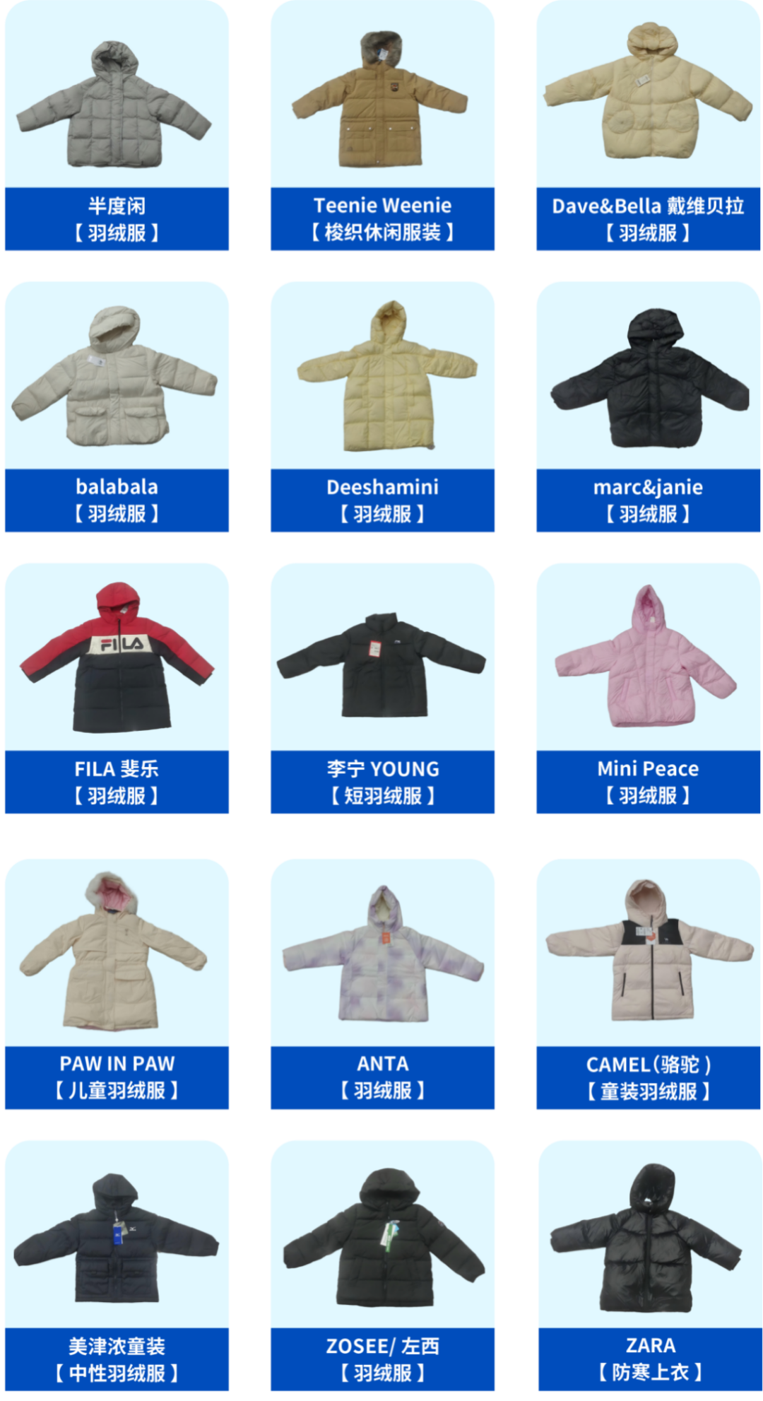 涉及品牌:NIKE、年衣、高梵、mette kids、英氏YeeHoO、波司登、齐齐熊®、balabala、李宁YOUNG、PAW IN PAW、CANADA GOOSE、asics kids、CONVERSE、鸭鸭、半度闲、TEENIE WEENIE KIDS、dave&bella® 戴维贝拉、Deeshamini、marc&janie、FILA、MINI PEACE、ANTA kids、CAMEL、美津浓童装、ZOSEE/左西、贝肽斯、雅鹿、PUMA®、Dickies、ZARA等30个知名及热门品牌。