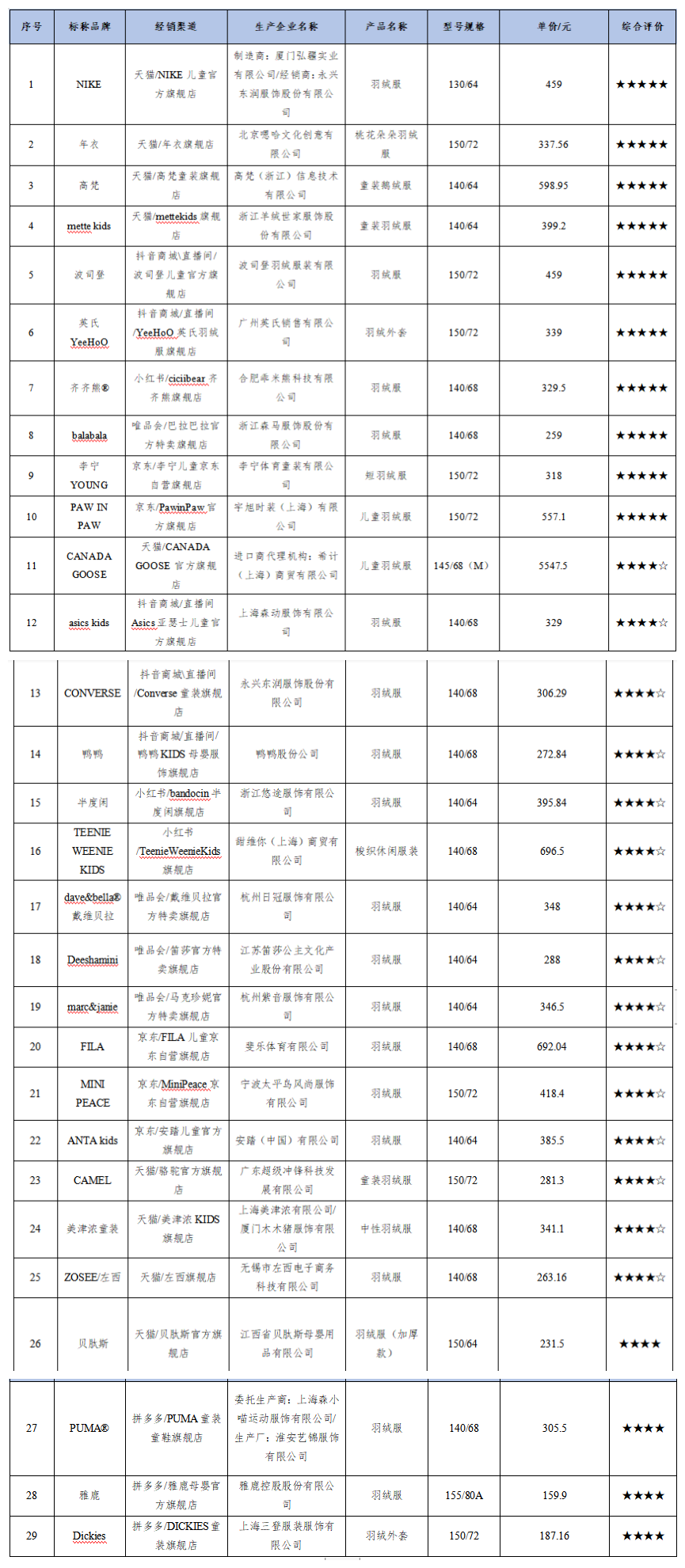 30款儿童羽绒服比较试验结果