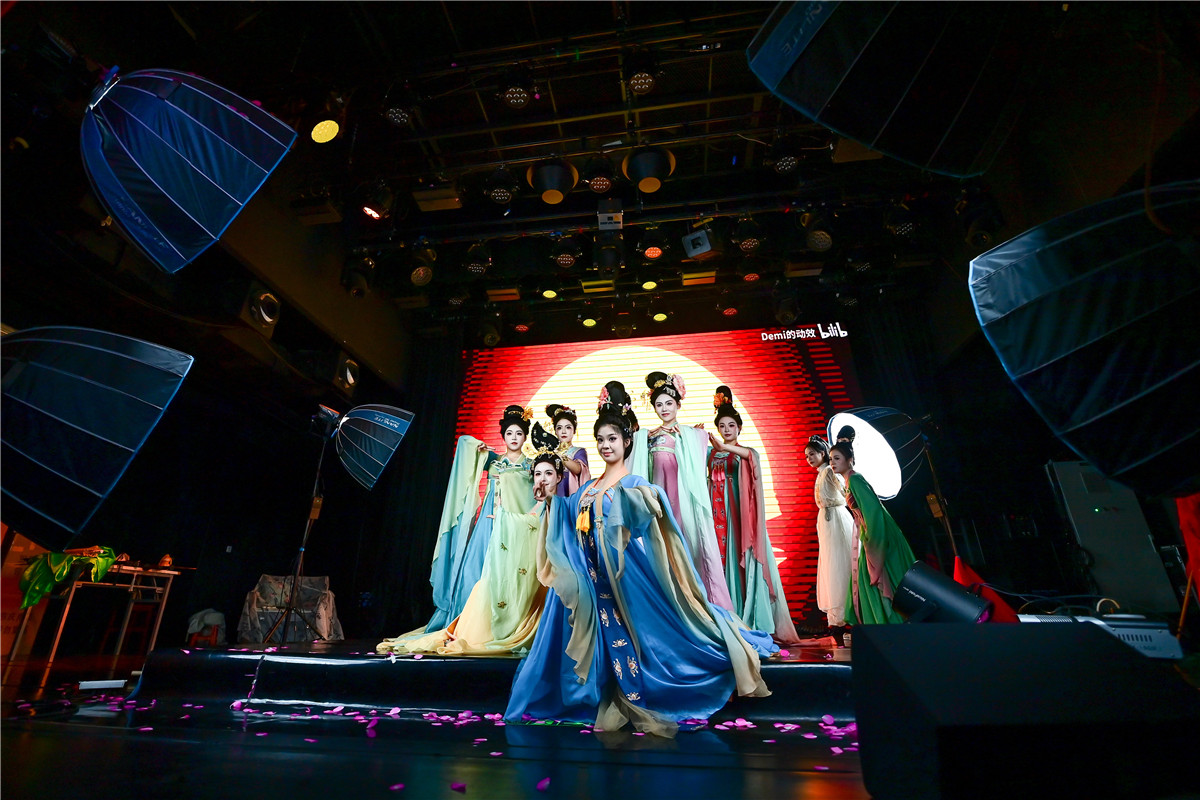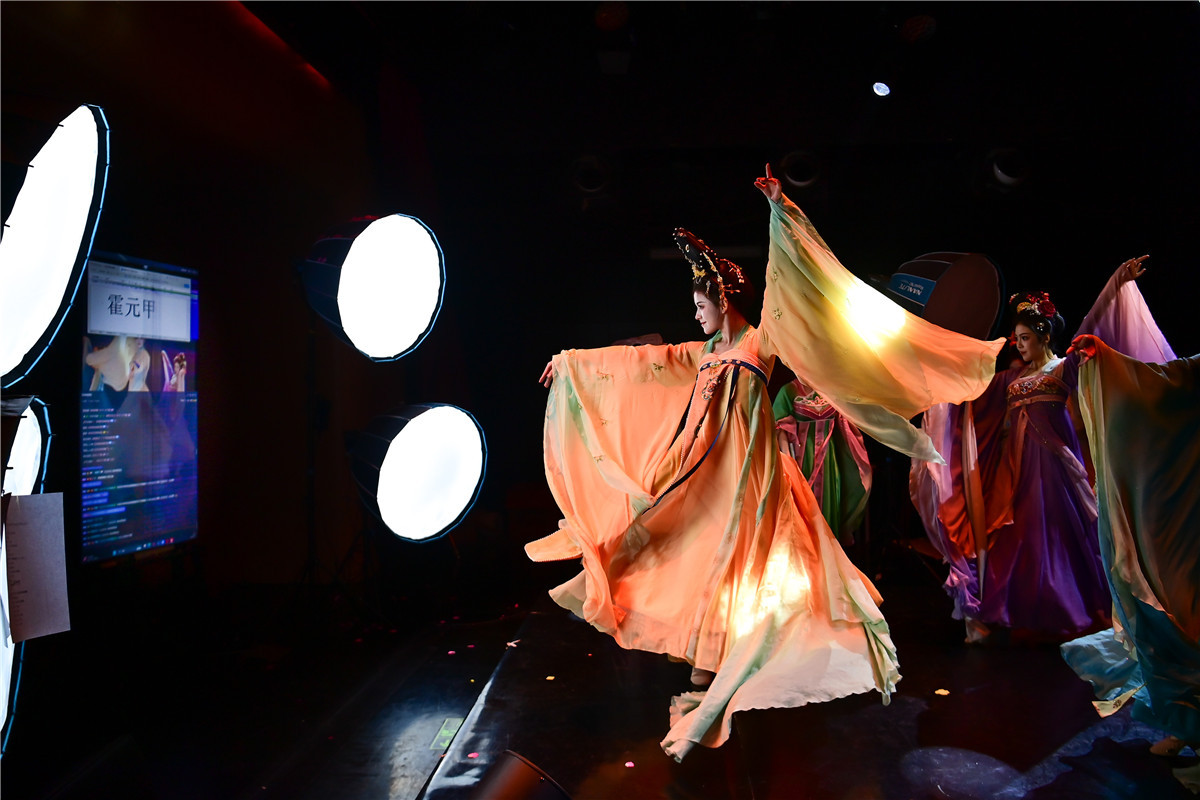 陕西省歌舞剧院的舞蹈演员在直播间进行“团播”表演。