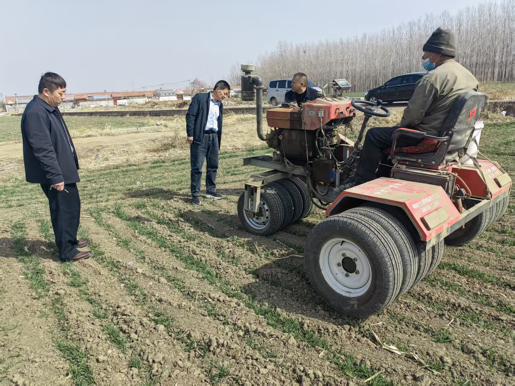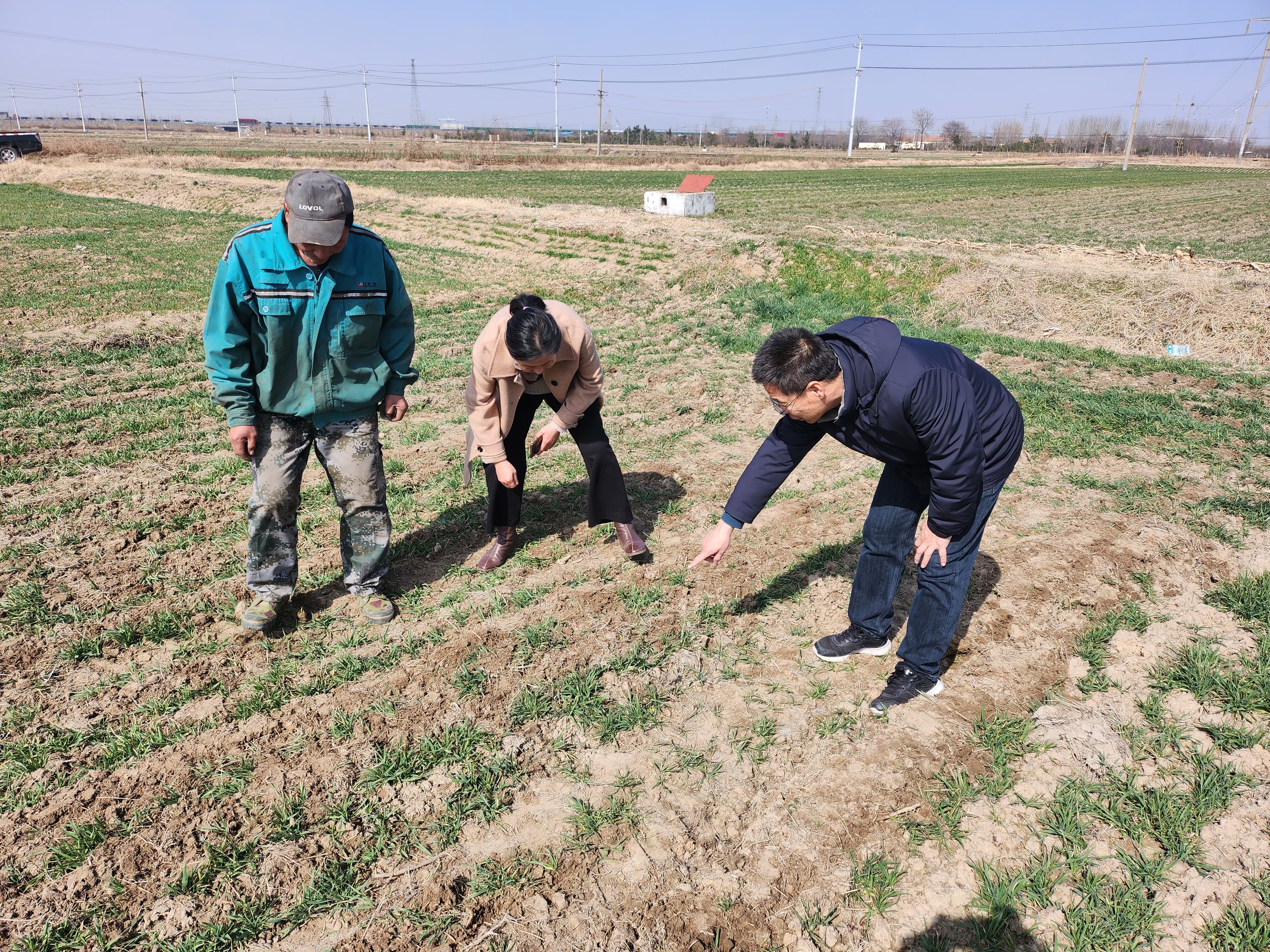 图为莒县招贤镇组织农技站人员到田间地头指导小麦镇压及施肥等田间管理工作