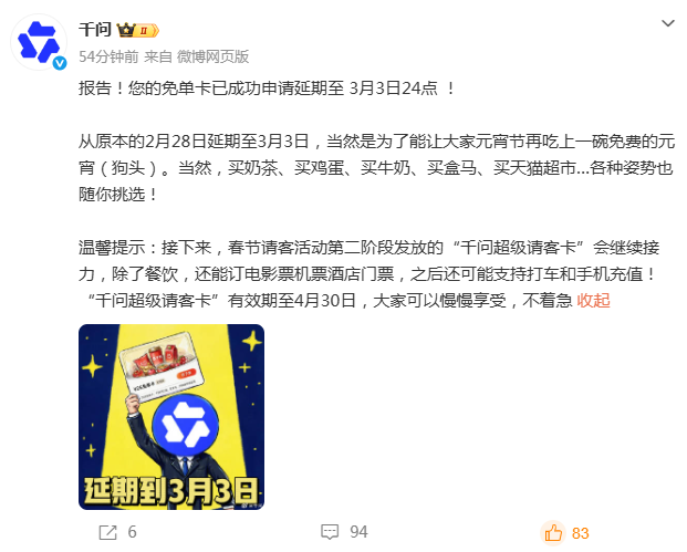 2月27日,千问官方微博称:报告!您的免单卡已成功申请延期至3月3日24点!