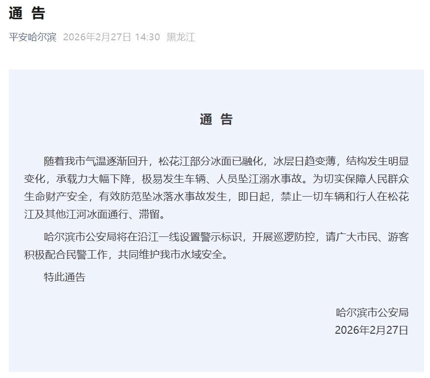 哈尔滨发布通告:松花江部分冰面已融化,即日起禁止通行、滞留
