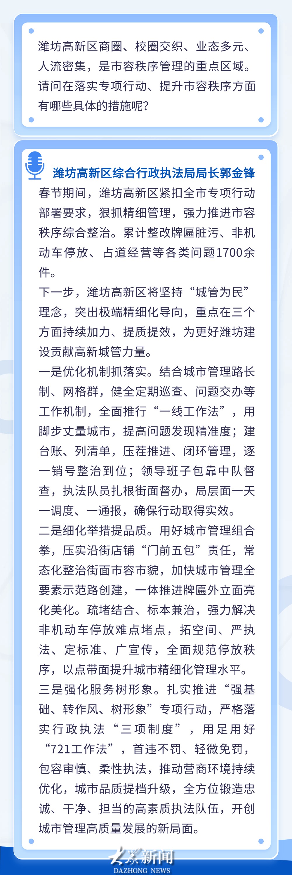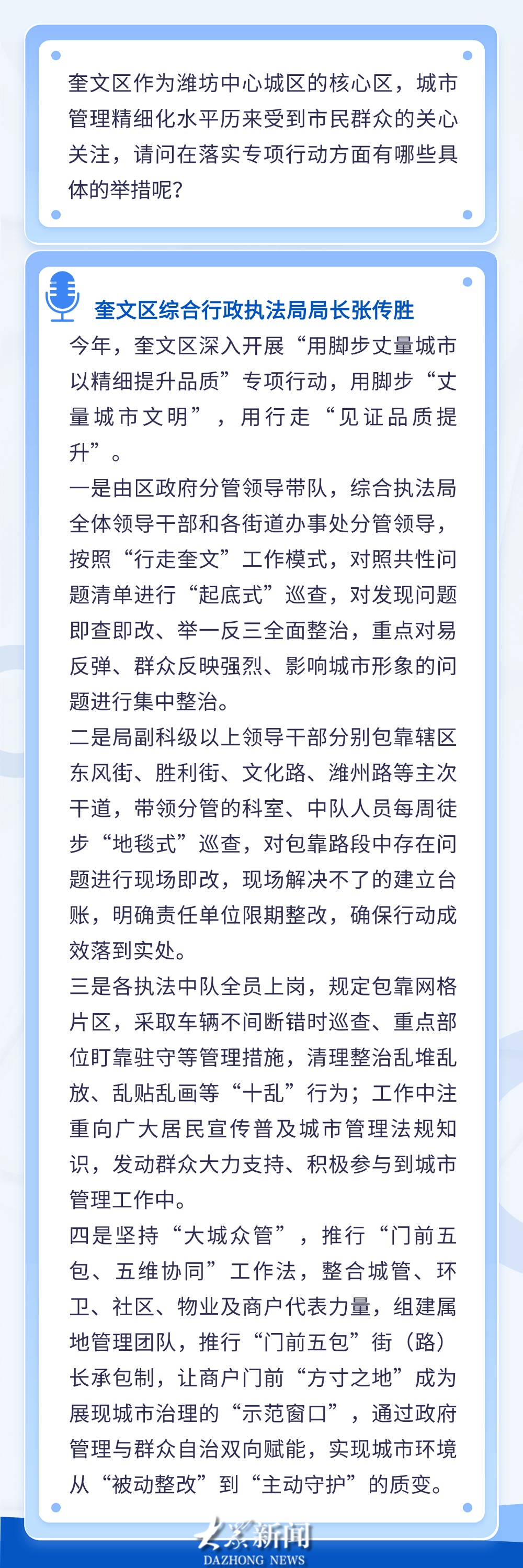据潍坊市城市管理局党组书记、局长戴向波介绍,近年来,城市发展进入新阶段,市民群众对优质公共服务的期待越来越高,城市管理面临的“细节考验”也越来越多。开展专项行动是顺应人民群众新期待的重要举措。随着城市转向存量提质阶段,人们对更干净整洁的环境、更规范有序的秩序有了更高期盼,需要我们主动解决问题,让群众享受便利。