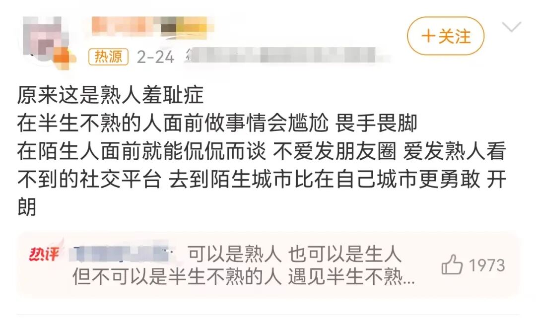 这几天,“熟人羞耻症”登上热搜,不少网友在话题下分享过年期间与亲戚朋友相处时的尴尬感受:对长辈的过度关心感到无所适从,面对亲戚朋友不好意思化妆,在饭局上不敢说太多话,远远看到许久未见的老同学,第一反应是绕道而行……