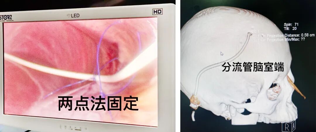 传统的手术方式需在颅骨钻孔约1.5cm,腹腔端分流管不固定,易发生远端包裹、移位等并发症,郝怀勇副主任医师通过技术改良,使用磨钻精准磨出直径0.5cm的骨孔,并成功置入脑室端分流管,肛肠外科吕超副主任医师在腹腔镜直视下,将分流管腹腔端精准固定于肝脏膈面镰状韧带上,确保分流管末端位于腹腔内合适位置,且不易被肠管、大网膜等组织包裹,从而让手术更微创,更安全,远期并发症降低。术后复查头颅CT显示脑室系统扩张较前明显缓解,分流管位置良好。患者淡漠症状减轻,智力水平恢复,能够独立行走,两便正常,一周后康复出院。