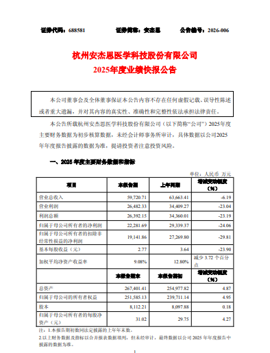 2月26日,安杰思(688581)披露2025年业绩快报,报告期内,公司实现营业总收入59,720.71万元,较上年同期下降6.19%;归属于母公司所有者的净利润22,281.69万元,较上年同期下降24.06%;归属于母公司所有者的扣除非经常性损益的净利润19,141.86万元,较上年同期下降29.81%。