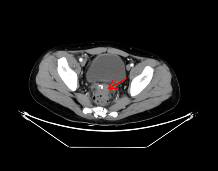 术前CT显示直肠前方一直径5cm圆形脓肿