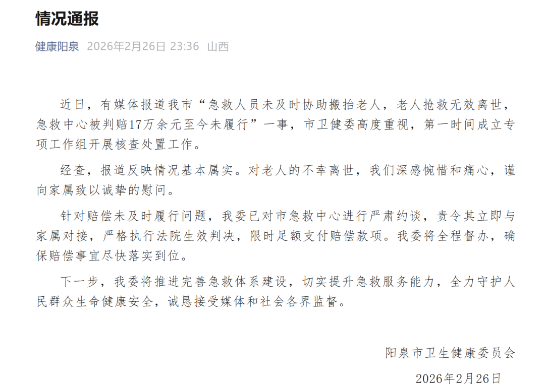 近日,有媒体报道阳泉市“急救人员未及时协助搬抬老人,老人抢救无效离世,急救中心被判赔17万余元至今未履行”一事,市卫健委高度重视,第一时间成立专项工作组开展核查处置工作。