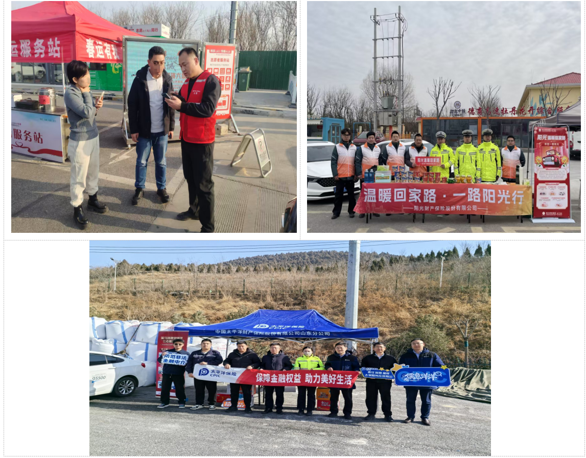 人保财险山东分公司开展“心服务 新服务”主题活动,在全省17处高速路口、景区等人流密集区域设立“心服务”驿站,投入理赔人员589人次,累计服务客户超4000人次;同步开设9处社会“关爱驿站”,为外卖骑手、快递员、环卫工人等新业态群体提供服务1500余次;理赔环节创新推出“返乡快赔”服务,假日期间最快实现5分钟线上查勘,2小时内完成定损赔付。太平洋财险山东分公司在省内主要高速出入口设立“暖心服务点”,为车主免费提供物资补给,累计投入理赔人员235名,处理车险案件11819件,提供拖车服务1021次、换胎及搭电服务2156次;依托数字化金融优势,面对突发事故实现“当日出险、当日调解、当日赔付”,保证理赔便捷。阳光财险山东分公司组织16家机构的160余名志愿者,在交通枢纽设置“阳光暖心驿站”,累计服务返乡旅客2000余人。凭借成熟的数字化服务能力,对符合条件的小额车损实行免单证、现场赔付,切实履行“城市中心30分钟、近郊1小时达”的服务承诺,让群众出行更安心。