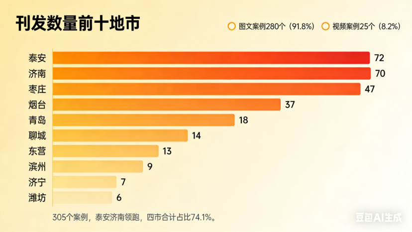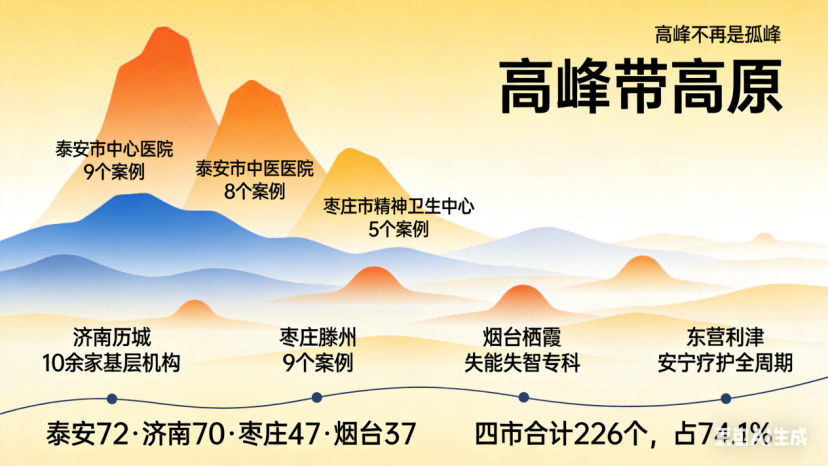 高峰不再是孤峰。它们在往下扎根,也在向外辐射。泰安的72个案例里,有21个来自基层;济南70个案例里,49个来自基层——高峰在长高,高原也在抬升。