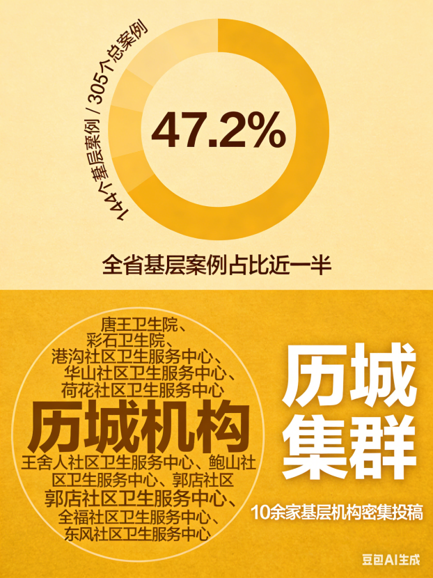基层已成为山东医养健康主力军。在济南,70%的案例来自基层机构,历城区尤为突出,唐王卫生院、彩石卫生院、港沟社区卫生服务中心等10余家基层机构密集投稿,形成“历城现象”。东营、济宁、烟台等地,基层机构投稿占比也已过半。