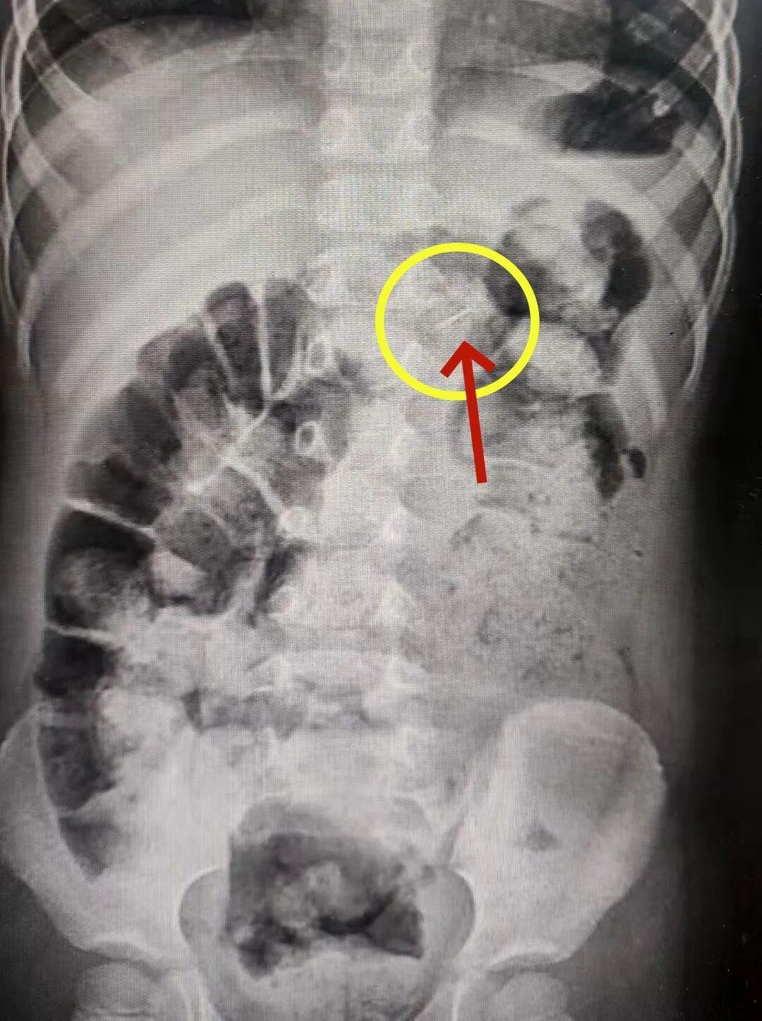 接诊医生高度警惕,第一时间安排影像学检查。片子清晰显示胃内一枚针状异物。