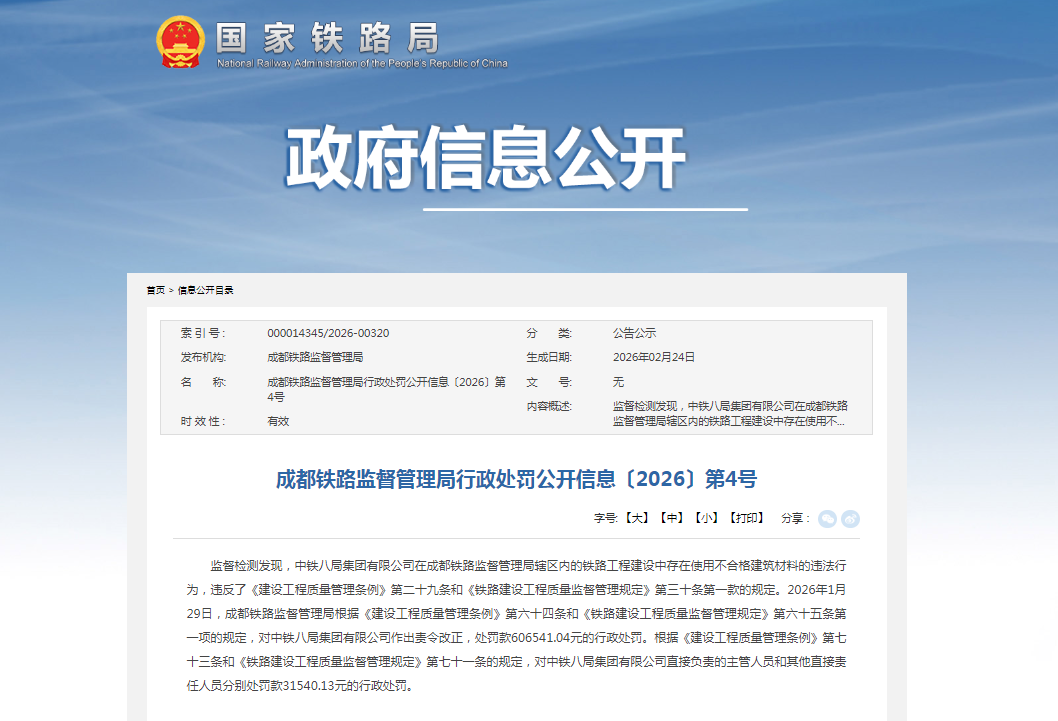 齐鲁晚报·齐鲁壹点记者于国家铁路局政府信息公开栏了解到,2月24日,其公示了成都铁路监督管理局行政处罚公开信息〔2026〕第4号。据悉,被行政处罚单位为中国中铁(601390.SH/00390.HK)旗下的中铁八局集团有限公司(下称“中铁八局”)。