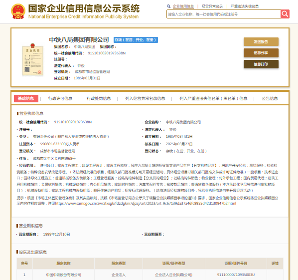 国家企业信用信息公示系统显示,中铁八局集团有限公司成立于1985年,注册资本590605.6335万元人民币,法定代表人为钟俊,由中国中铁全资持股。