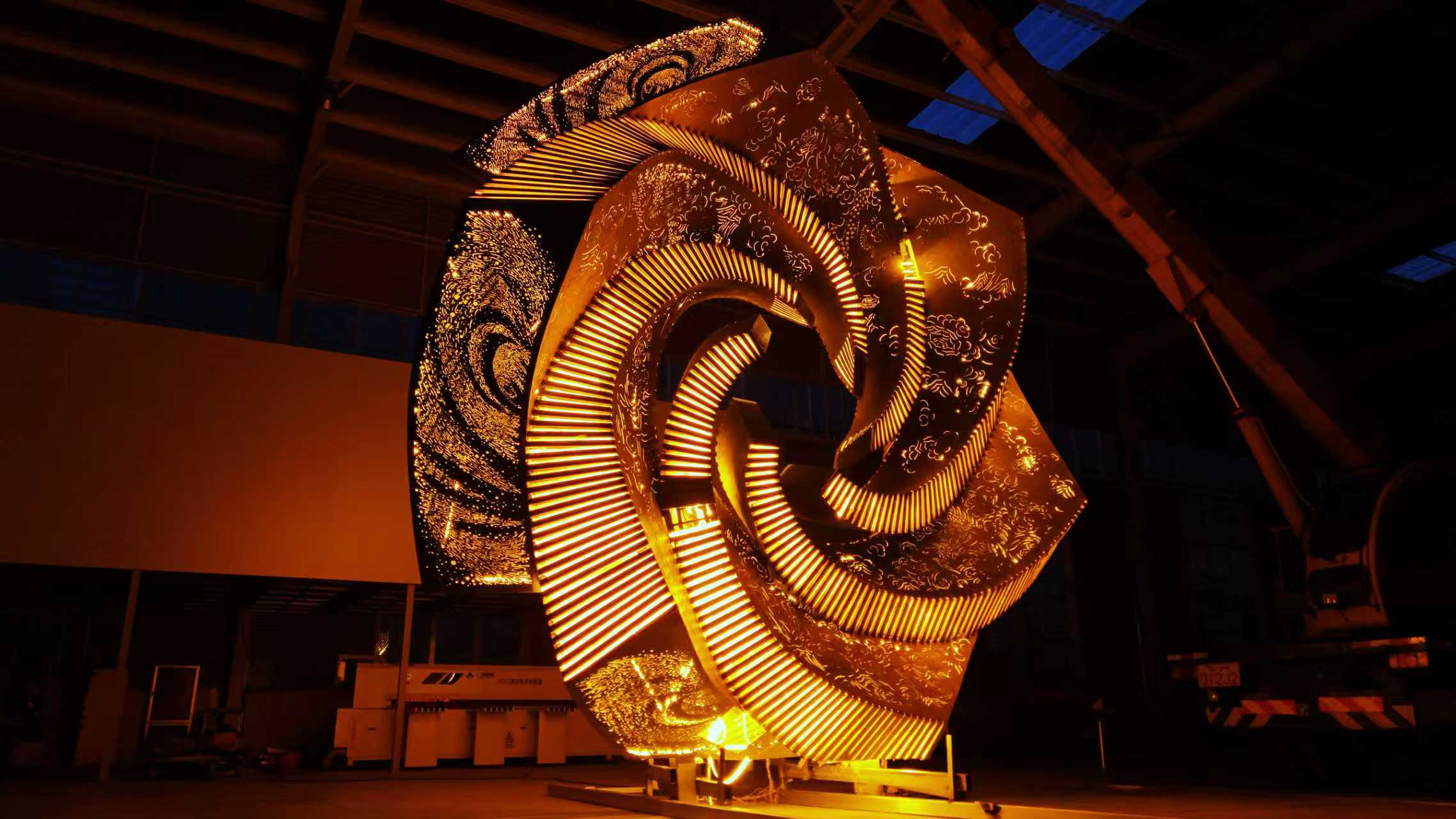 “除了大型商业会展,高品质艺术展、文化展也是我们重点深耕的领域。” 在预搭建现场,该公司设计师崔小清指着一件已成型的艺术装置作品介绍道。“这件作品,是为‘百鸟朝凤’主题艺术展量身打造的核心展品之一。我们采用精细镂空工艺,将青龙、白虎、朱雀、玄武传统四圣兽图案立体呈现,内部搭配专业光影系统,灯光透过镂空纹理缓缓漫出,光影流转间,宛如璀璨星河铺展眼前,既有传统纹样的厚重底蕴,又兼具现代艺术的视觉冲击力。”