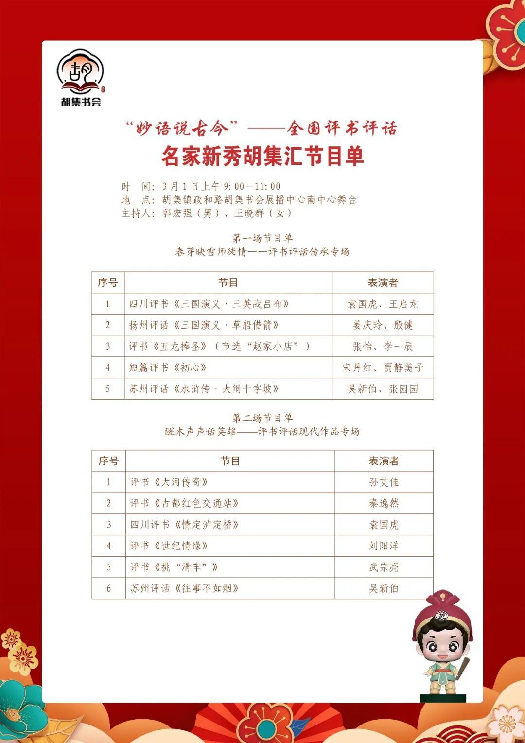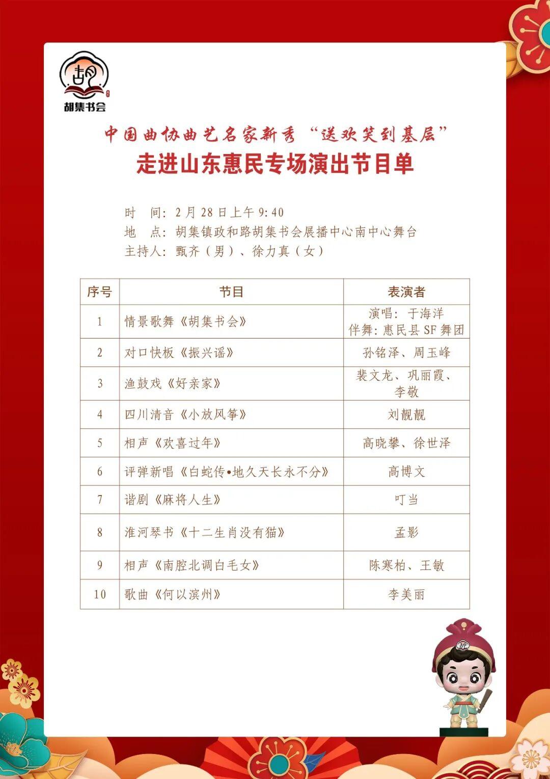 春意渐浓,曲韵飘扬。2026年胡集书会将于2月28日至3月1日在山东滨州惠民县胡集镇举办,本届书会汇聚中国曲艺家协会名家新秀,集结全国各地美丽乡村优秀节目,评书、快板、琴书等多种曲艺形式同台亮相,既有经典传承,又有时代新作,为广大曲艺爱好者献上一场浓郁新春氛围的视听文化盛宴。