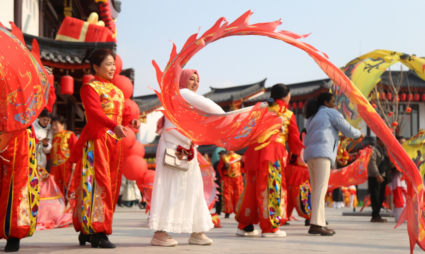 沿街走去,展演的队伍随处可见。广场上,彩带龙翻卷成浪,几十米长的龙身在空中一抖一抖;商业街口,秧歌队踩着鼓点走位,红绸飞扬……12个县(市、区)21个传统民间艺术节目,上千人演出团队分布在多个点位,打破传统舞台演出模式,创新采用“行进式观演+穿行式互动”方式,形成“人在景中走,艺在身边演”的沉浸式体验。