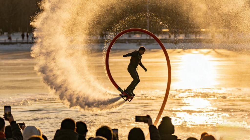 而当夜幕降临,同一片湖面将上演更加震撼人心的场景。还是那群飞人,手中却多了燃烧的火壶。脚踏喷射装置凌空而起,舞动的火壶在夜空中划出绚丽的弧线,火焰与水面倒影交相辉映,仿佛天火降临。每晚三场的“空中火壶”表演,其壮观程度堪比打铁花,将为游客带来惊艳难忘的夜晚。