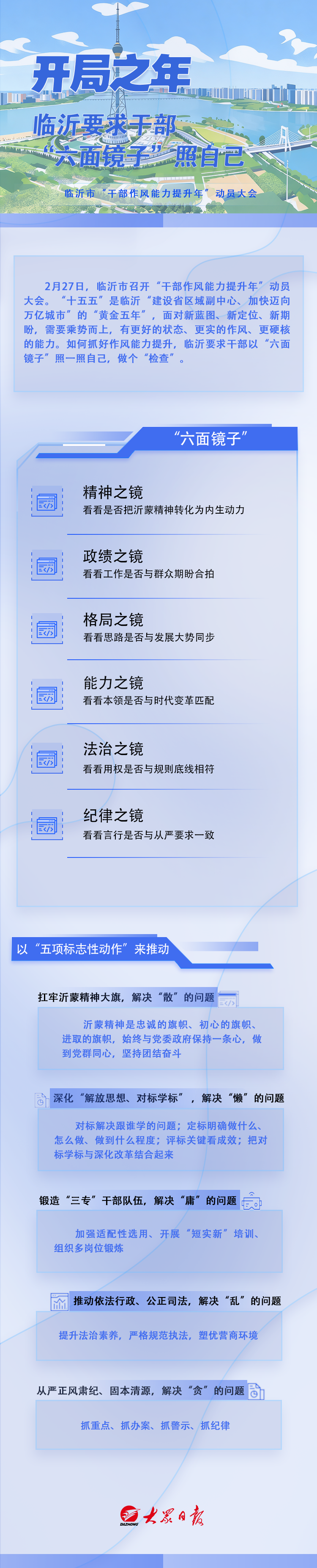 2月27日,临沂市召开“干部作风能力提升年”动员大会。“十五五”是临沂“建设省区域副中心、加快迈向万亿城市”的“黄金五年”,面对新蓝图、新定位、新期盼,需要乘势而上,有更好的状态、更实的作风、更硬核的能力。如何抓好作风能力提升,临沂要求干部以“六面镜子”照一照自己,做个“检查”。(大众新闻记者杜辉升周浩达设计徐明)