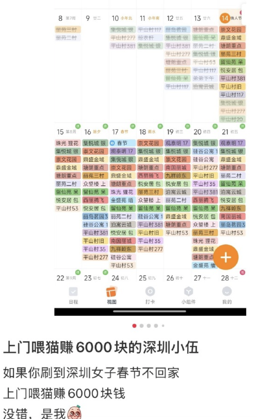 “从腊月二十五到正月初七,档期全排满了,一天要跑七八家。”在大连市上大学的小张,也在春节假期期间兼职做上门喂养,小张向记者展示了他的日程表,“客户把家门钥匙交给我,是对我的信任。每次进门先消毒,全程录视频,走的时候把垃圾带走。虽然辛苦,但看到猫咪们信任的眼神,觉得特别值。”