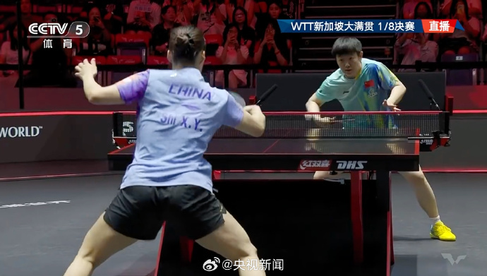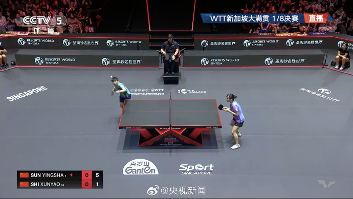 今天(27日),WTT新加坡大满贯女单1/8决赛,孙颖莎以3-1(11-2、7-11、11-7、11-6)战胜石洵瑶,晋级八强,实现2026年WTT新加坡大满贯3连胜。(央视体育)