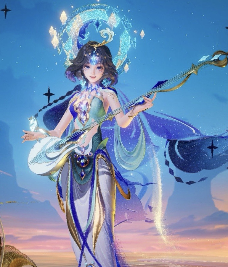 “这款皮肤运用了龟兹石窟非常有代表性的菱格图案、源于天然矿石的青金石蓝和石绿色、卷草和连珠纹样。可以说,设计师把这些元素用到极致,从人物的服装、发饰、手持乐器到连招、游戏场景,处处可见。”张婷说,当她们看到《王者荣耀》工作室发来的设计样板时,觉得够漂亮、够精致、够时尚,“比如把菱格变成多种样式用在乐器、腰带、身体彩绘上的设计,超出了我们的想象。”