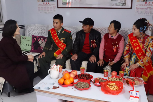 大红喜服与绿色军装在张灯结彩的客厅里相映生辉。县退役军人事务局相关负责同志为张子良及其家属细致讲解拥军优属政策。“你在部队好好干,家里的事有我们!”这不仅是一次政策的送达,更是一份来自“娘家人”的深情嘱托,让军人军属倍感温暖,更激励军人在军营安心服役、再创佳绩。