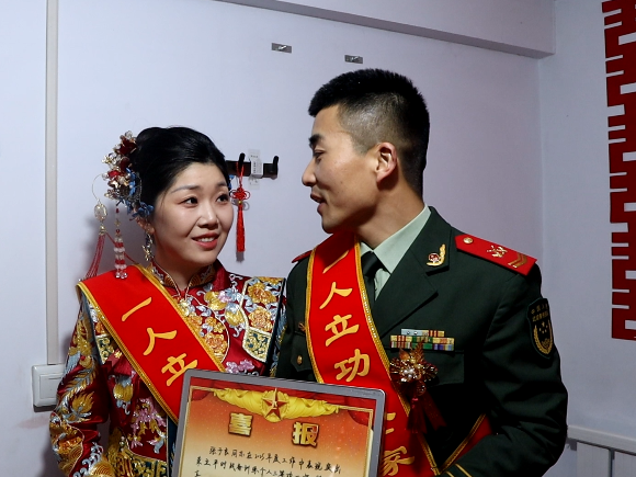 当立功喜报遇上火红“囍”字,家国情怀与儿女情长在此刻交织。张子良紧紧握着妻子的手,激动地说:“这份特殊的荣誉,是我送给妻子最好的新婚礼物,也是我继续精武强能的动力。感谢组织的培养,家乡党委、政府的鼓励和家人的支持,我会带着这份荣光,在强军路上继续奔跑,为祖国站好岗,守好大家,也护好小家。”