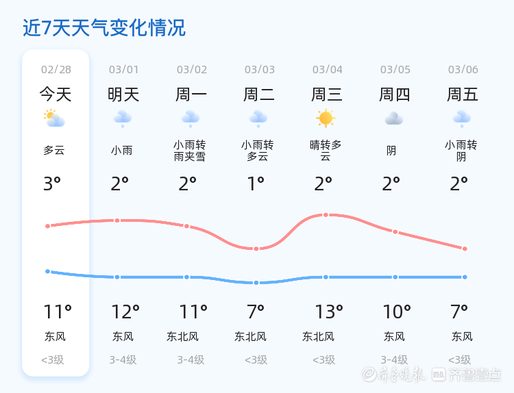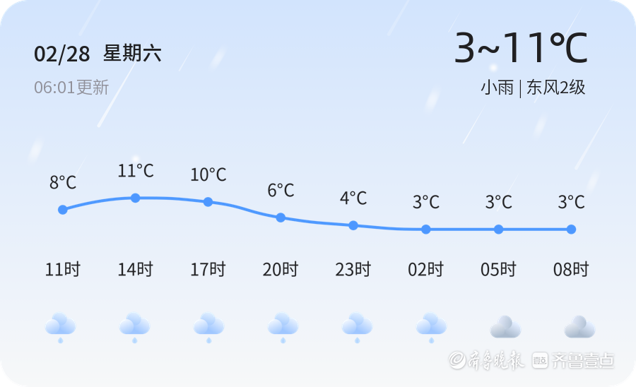 今天是2月28日,星期六,农历正月十二。淄博市迎来小雨天气,气温在3℃至11℃之间。全市各区普遍有小雨,东风2级,空气湿度83%,PM2.5指数为115。市民出行需注意携带雨具,防范降雨对交通的影响。