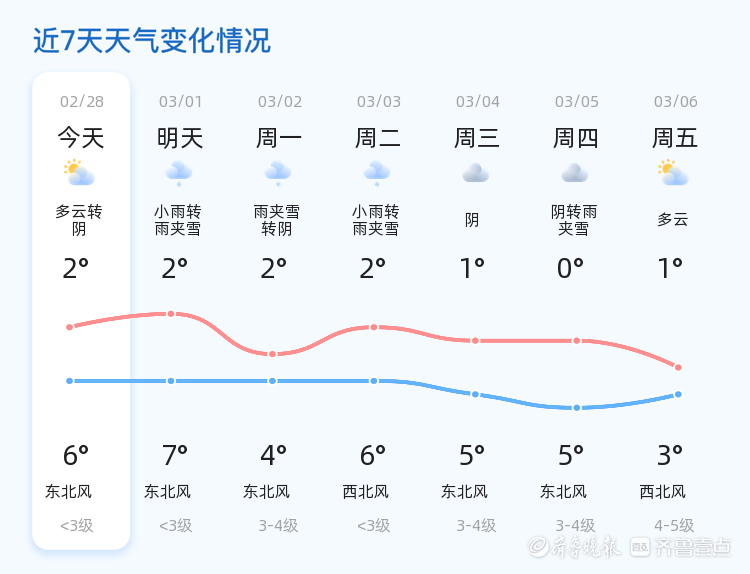 今天是2月28日,星期六,农历正月十二。威海市今日天气多云转阴,气温介于2℃至6℃之间。全市各区普遍出现多云转阴天气,西北风1级,空气湿度达到100%,PM2.5指数为72,空气质量良好。当前时间为早上605,实时气温为2.1℃。