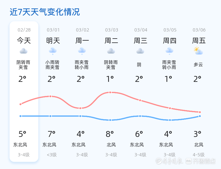 今天是2月28日,星期六,农历正月十二。烟台市今日天气以阴转雨夹雪为主,气温较为寒冷,最高气温5℃,最低气温2℃,北风1级。各区天气情况基本一致,均为阴转雨夹雪,市民出行请注意保暖和防滑。nn明天(3月1日),烟台市天气将转为小雨转雨夹雪,气温与今日相比略有上升,最高气温7℃,最低气温2增强,东北风3-4级。市民需做好防寒准备,雨具随身携带。nn未来三天(3月2日至3月4日),烟台市天气将以雨夹雪、阴天为主,气温波动不大,最高气温8℃,最低气温1℃。风力维持在东北风3-4级左右,部分地区可能出现降雪天气。提醒市民及时关注天气变化,出行注意安全,避免因路面湿滑发生意外。nn温馨提示