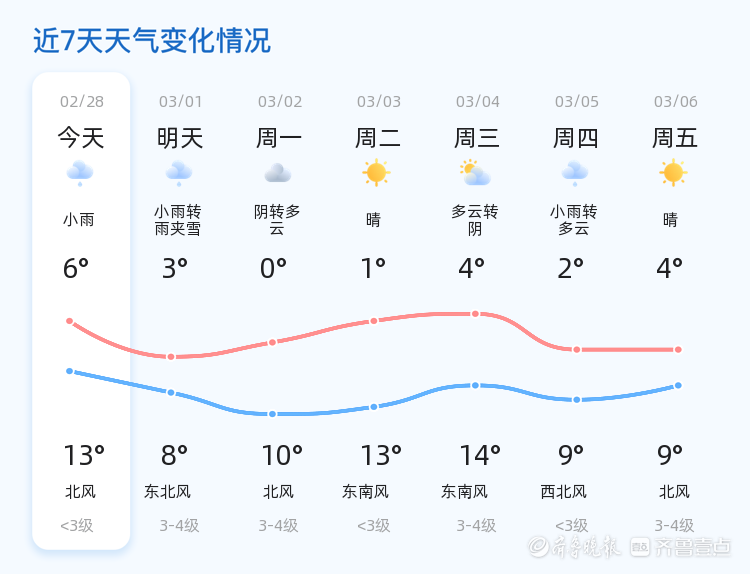 今天是2026年2月28日,农历正月十二,星期六。济宁市今日天气以阴转小雨为主,气温在6℃到13℃之间,北风1级,空气湿度较高,为90%。PM2.5指数为142,属于中度污染。今日各区均以阴雨天气为主,市民出行请注意携带雨具,注意交通安全。明天天气较今日有所变化,预计明天将出现小雨转雨夹雪的天气,气温有所下降,最高气温为8℃,最低气温为3℃,东北风3-4级。相比今日,明日天气更加寒冷且伴有降雪,市民需提前做好防寒保暖准备。未来三天,济宁市天气趋势为周一阴转多云,周二和周三以晴或多云为主,但气温较低,最低气温可达0℃。周四将再次出现小雨天气,气温有所回升。建议市民密切关注天气变化,尤其是雨雪天气可能对交通造成的影响,出行时请注意安全。温馨提示
