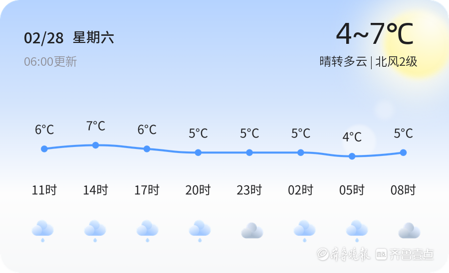 今天是2026年2月28日,农历正月十二,星期六。青岛市今日天气晴转多云,北风2级,空气湿度87%,PM2.5指数为114,空气质量为轻度污染。目前气温为1℃,白天最高气温预计将达到7℃,夜间最低气温为4℃。市民朋友们在外出时请注意保暖,建议佩戴口罩,减少长时间户外活动,以免受凉或吸入污染物。今天的天气总体适宜出行,但由于空气质量等级为轻度污染,敏感人群应特别注意防护。同时,莱西市发布了大雾黄色预警信号,部分地区可能出现能见度小于500米的大雾,市民在早晨和上午出行时需特别注意交通安全,减速慢行,确保行车安全。