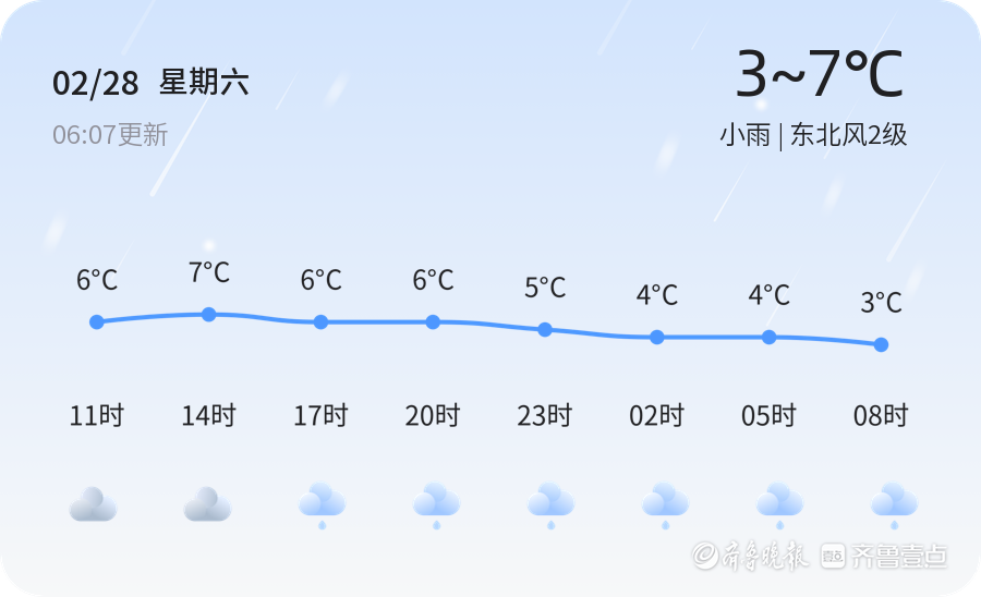 今天是2026年2月28日,星期六,农历正月十二。聊城市今日天气为小雨,气温在3℃至7℃之间,东北风2级,空气湿度为81%,PM2.5浓度为97,属于良好空气质量。今日阴雨天气对市民出行带来一定影响,建议市民外出携带雨具,注意防寒保暖。