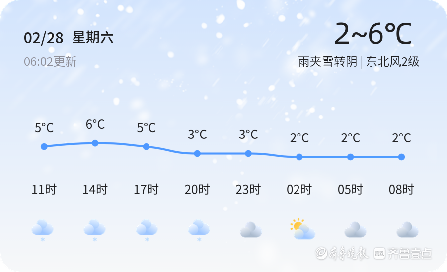 今天是2月28日,星期六,农历正月十二。东营市迎来雨夹雪转阴的天气,全市各区气温普遍较低,最高气温6℃,最低气温2℃。目前气温为2.1℃,风力为东北风2级,空气湿度为74%,PM2.5指数为53,空气质量良好。预计今日气温变化不大,市民出行需注意防寒保暖。