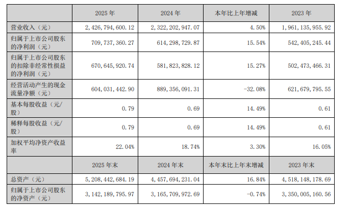2月26日晚间,注册地位于济南高新区的上市公司——华明装备(002270.SZ)交出2025年业绩“答卷”:全年实现营业收入24.27亿元,同比增长4.5%;归母净利润7.10亿元,同比增长15.54%;扣非后净利润6.71亿元,同比增长15.27%。