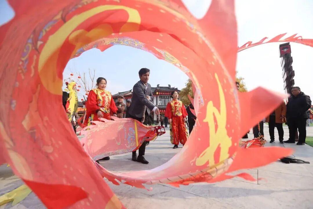 沿街走去,展演的队伍随处可见。广场上,彩带龙翻卷成浪,几十米长的龙身在空中一抖一抖;商业街口,秧歌队踩着鼓点走位,红绸飞扬……
