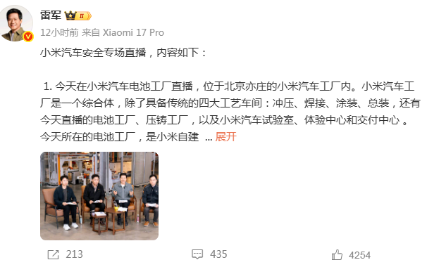 2月27日,小米创办人、董事长兼CEO雷军在小米汽车工厂里进行直播,与多位小米技术专家畅聊小米汽车的安全体系。