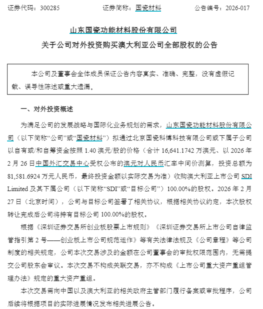 2月27日晚,国瓷材料(300285.SZ)发布公告称,拟通过北京国瓷科博科技有限公司或下属子公司以自有或自筹资金按照1.4澳元/股的价格收购澳大利亚上市公司SDI Limited及其下属公司(下称“SDI”)100%的股权,交易总价16641.17万澳元(约8.16亿元人民币,按2月26日澳元兑人民币中间价测算)。