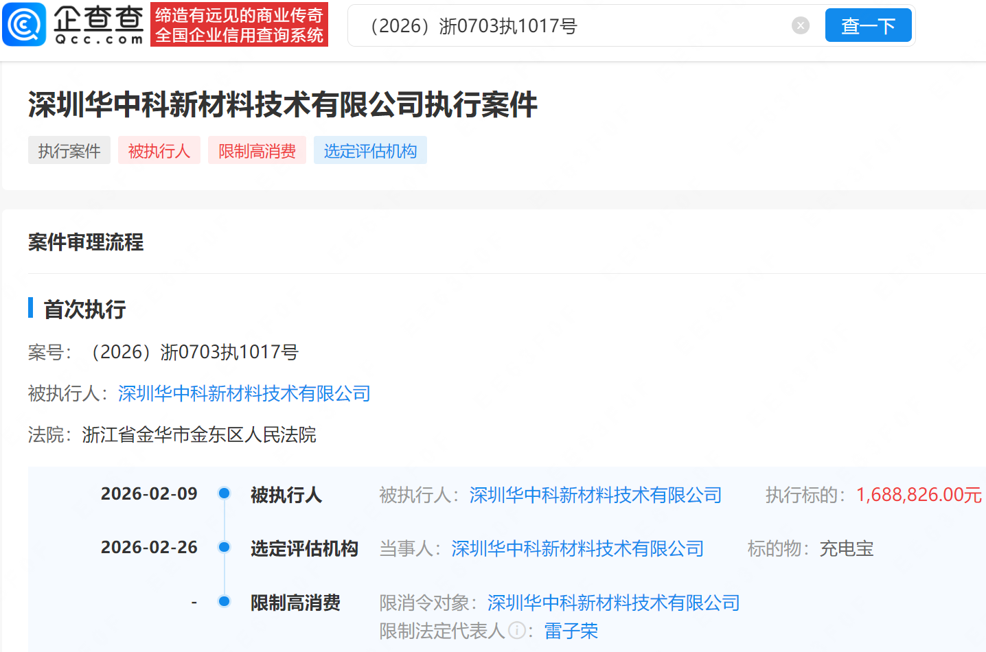 企查查APP显示,近日,深圳华中科新材料技术有限公司及其法定代表人雷子荣新增一则限制消费令,执行法院为浙江省金华市金东区人民法院。此前,该公司已因此案被执行168万余元。该公司成立于2019年3月,注册资本606.06万元,经营范围包含电子产品销售、电池销售、电池制造等,由深圳罗马仕科技有限公司、雷子荣共同持股。(企查查)