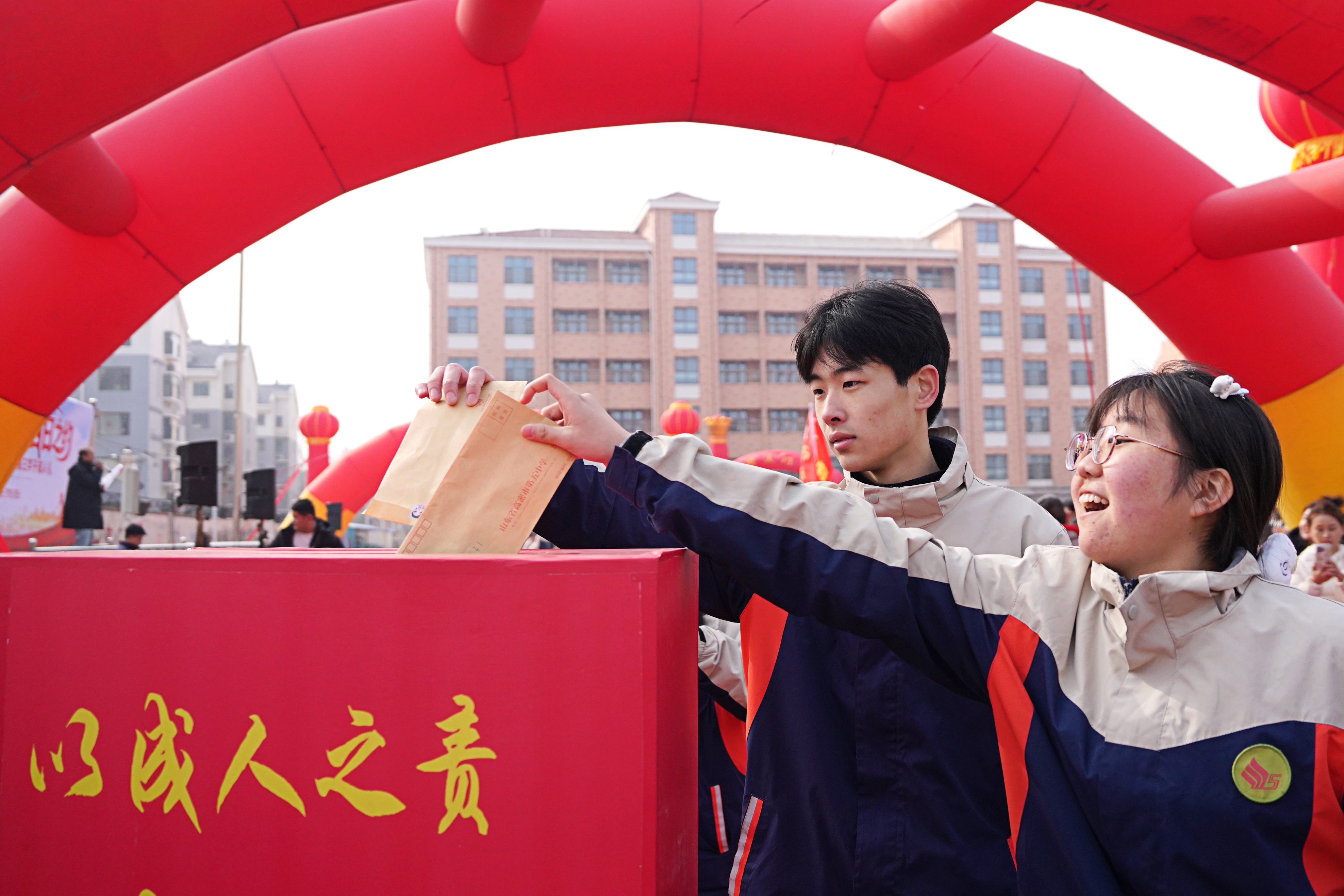 2月27日,在潍坊高密市一所中学,高三学生参加成人礼。仪式上,学生们加冠宣誓、跨越成人门。此次活动标志着学生们正式迈入成人行列,旨在强化其公民意识与社会责任感,激励他们以更成熟的姿态迎接高考与人生挑战。