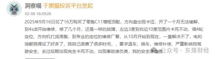 另一位2026款零跑C11增程300激光雷达智尊版车主投诉称:“花了16万购买了零跑C11增程顶配,方向盘出现问题,开了一个月无法缓解,到4s店开始维修,修了几个月,还是一样的故障,左边3度到右边10度范围内卡死不动。调4轮定位,方向机打润滑脂,到专业的定位的维修厂看,从10月开始到现在,一直解决不了!”